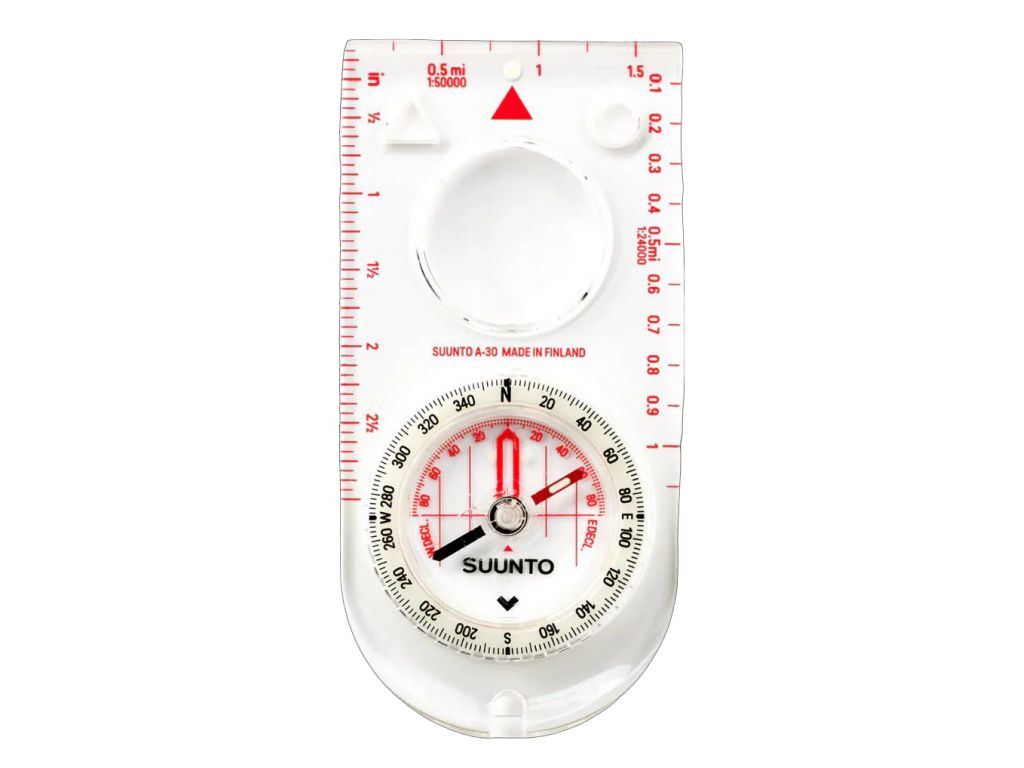 SUUNTO A-30 prepracovaný kompas vhodný hlavne na horskú turistiku s luminiscenčnými značkami pre jeho využitie aj v noci. Má základné vlastnosti Suunto kompasov ako kvalitné ložisko, kvapalinovú výplň či fixnú korekcia magnetickej deklinácie. Okrem týchto, navyše disponuje zväčšujúcim sklom a otvormi na značenie kontrolných bodov. Aby sa jednoducho používal aj v noci, jeho rám a značky na strelke svietia v tme. Pravítka po obvode poskytujú štyri rôzne mierky.